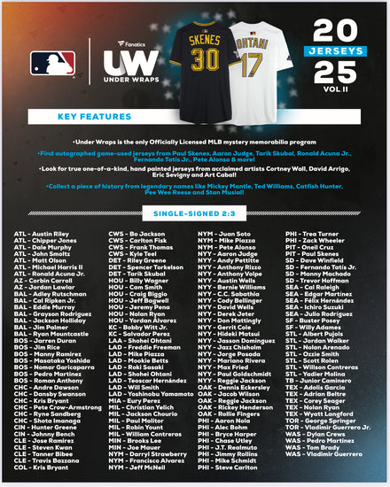 Baseball fans, it's time to swing for the fences. The 2025 Under Wraps MLB Jerseys mystery box is loaded and built for collectors who crave the thrill of the unknown. Crack open the box and reveal a legit, officially licensed, autographed jersey from one of the game's biggest names or legendary icons. Find autographed game-used jerseys from Paul Skenes, Aaron Judge, Tarik Skubal, Ronald Acuna Jr., Fernando Tatís Jr., Pete Alonso & more! Under Wraps is perfect for serious collectors and new collectors by giving an opportunity at unwrapping some of the biggest names in baseball history.