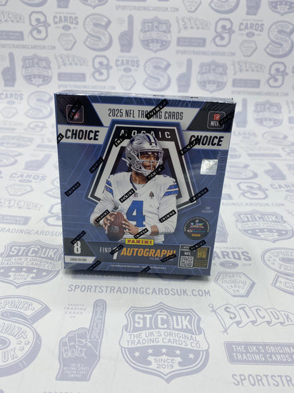 True to its vibrant legacy, 2025 Mosaic Football delivers one of the most colorful, powerfully paralleled base sets of the year, featuring the game's biggest current stars, most promising rookies and most iconic legends. 2025 Mosaic Football delivers a bevy of chase-worthy autograph featuring must-have parallels, star-studded checklists and Choice-exclusive parallels. Look for a stunning array of jaw-dropping case-chase SSPs, headlined by Micro Mosaic, Stained Glass, Money and more.