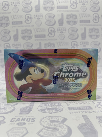 The wonder of Disney meets the magic of Topps in this all-new Disney Chrome 2025 trading card set. All your favorites are here on stunning Chrome tech and for the first time, we’re proud to present rare authentic autograph cards of some of the greatest live action and voice talent from the epic history of Disney and Pixar. Collect the 200-card base set on stunning Chrome tech. All your favorite Disney and Pixar characters are here – plus, for the first time, look for base cards of Disney Live Action heroes. Also look out for special inserts and incredible sketch cards. This, plus much more, in 2025 Disney Chrome!