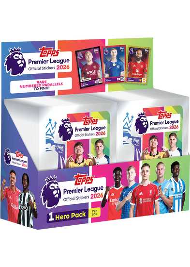 The Full Box contains 100 packets of Premier League Stickers (6 stickers per packet) with a guaranteed Hero Packet inside every Full Box. Look out for rare numbered parallels inside lucky packets!